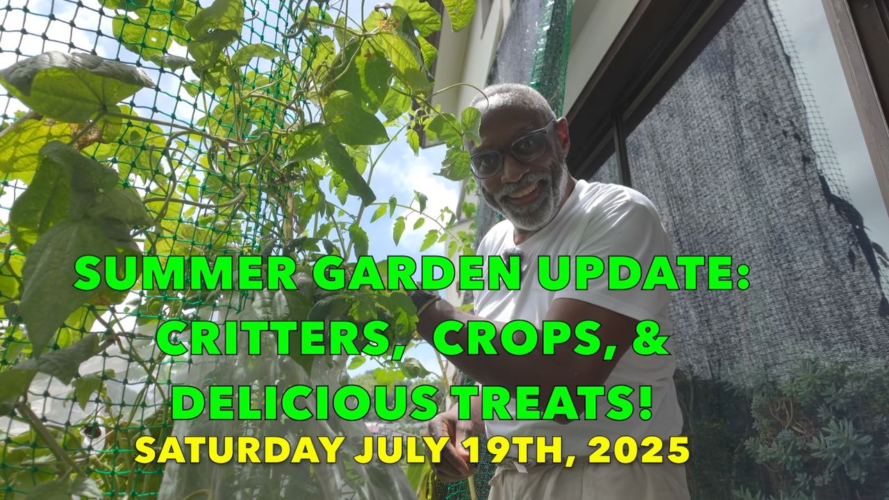 Well, summer is in full swing, now that our rainy season is over. But the battle against invading critters and insects continues; I lost some beautiful tomatoes this week…but more are on the way. The okra is growing very well and the mini-tomatoes should produce a bumper crop soon. I bought an interesting melon this week from a mobile green grocer, hopefully a preview of the melons I’m growing now in the grow room. I got a small but good harvest of my May Queen potatoes. And in the kitchen I made an apple up-side-down cake and some real peach-chocolate chip ice cream. Join me and Haru for a week in review!