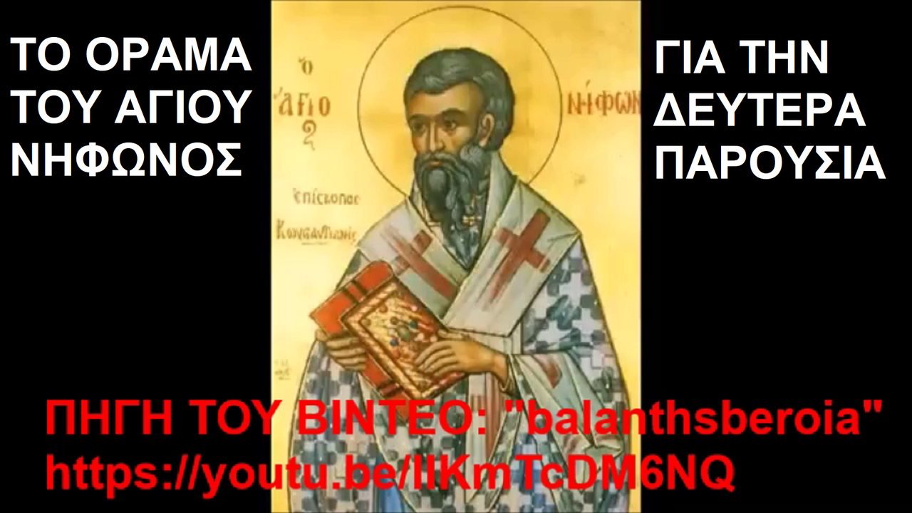 ΕΙΔΑ ΤΗΝ ΔΕΥΤΕΡΑ ΠΑΡΟΥΣΙΑ ΤΟΥ ΧΡΙΣΤΟΥ, ΑΓΙΟΣ ΝΗΦΩΝ https://ugetube.com/watch/gFIbvCPACwU3ble , https://rumble.com/v58loj1-i-saw-the-second-coming-of-christ-agios-nifon.html . ΤΟ ΟΡΑΜΑ ΤΟΥ ΑΓΙΟΥ ΝΗΦΩΝΟΣ ΕΠΙΣΚΟΠΟΥ ΚΩΝΣΤΑΝΤΙΑΝΗΣ ΓΙΑ ΤΗΝ ΔΕΥΤΕΡΑ ΠΑΡΟΥΣΙΑ ΚΑΙ ΤΗΝ ΜΕΛΛΟΥΣΑ ΚΡΙΣΗ. Πρωτογενής πηγή: Ἀπό τό Βιβλίο «ΕΝΑΣ ΑΣΚΗΤΗΣ ΕΠΙΣΚΟΠΟΣ», Ἁγίου Νήφωνος Ἐπισκόπου Κωνσταντιανῆς. Ἔκδοση Ἱερᾶς Μονῆς Παρακλήτου - Ὠρωπός. Δευτερογενείς πηγές: https://youtu.be/IIKmTcDM6NQ?feature=shared , https://ioanniskomninos.blogspot.com/2024/07/blog-post_26.html .