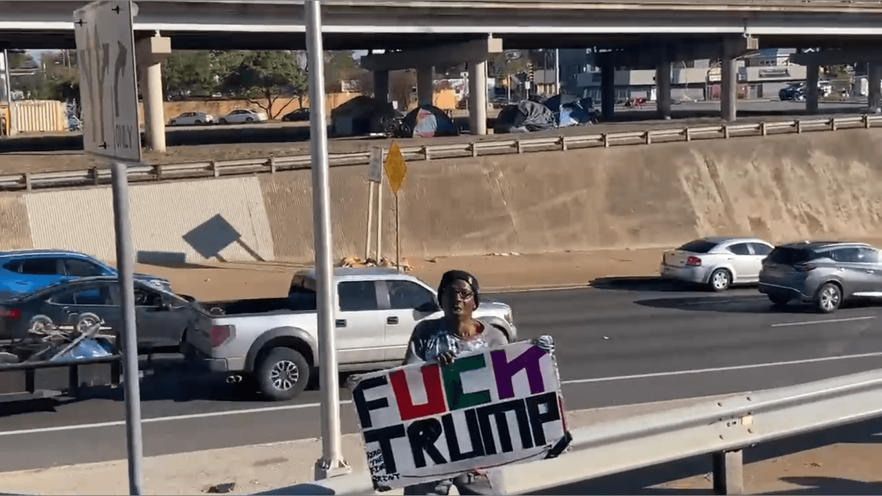 Deranged Homeless Man Paid By Democrat Party To Hold Trump Sign ( 11-9-2019 )