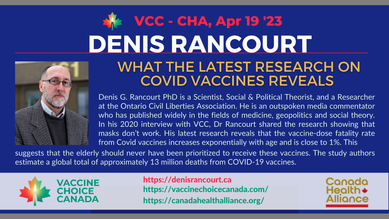 Apr 19/23 Interview - Denis G. Rancourt PhD is a Scientist, Social & political Theorist, and a Researcher at the Ontario Civil Liberties Association. He is an outspoken media commentator who has published widely in the fields of medicine, geopolitics and social theory. In his 2020 interview with VCC, Dr. Rancourt shared the research showing that masks don’t work. His latest research reveals that the vaccine-dose fatality rate from Covid vaccines increases exponentially with age and is close to 1% -compared to < 0.01 % for young adults (< 45 year olds). This suggests that the elderly should never have been prioritized to receive these vaccines. The study authors estimate a global total of approximately 13 million deaths from COVID-19 vaccines.