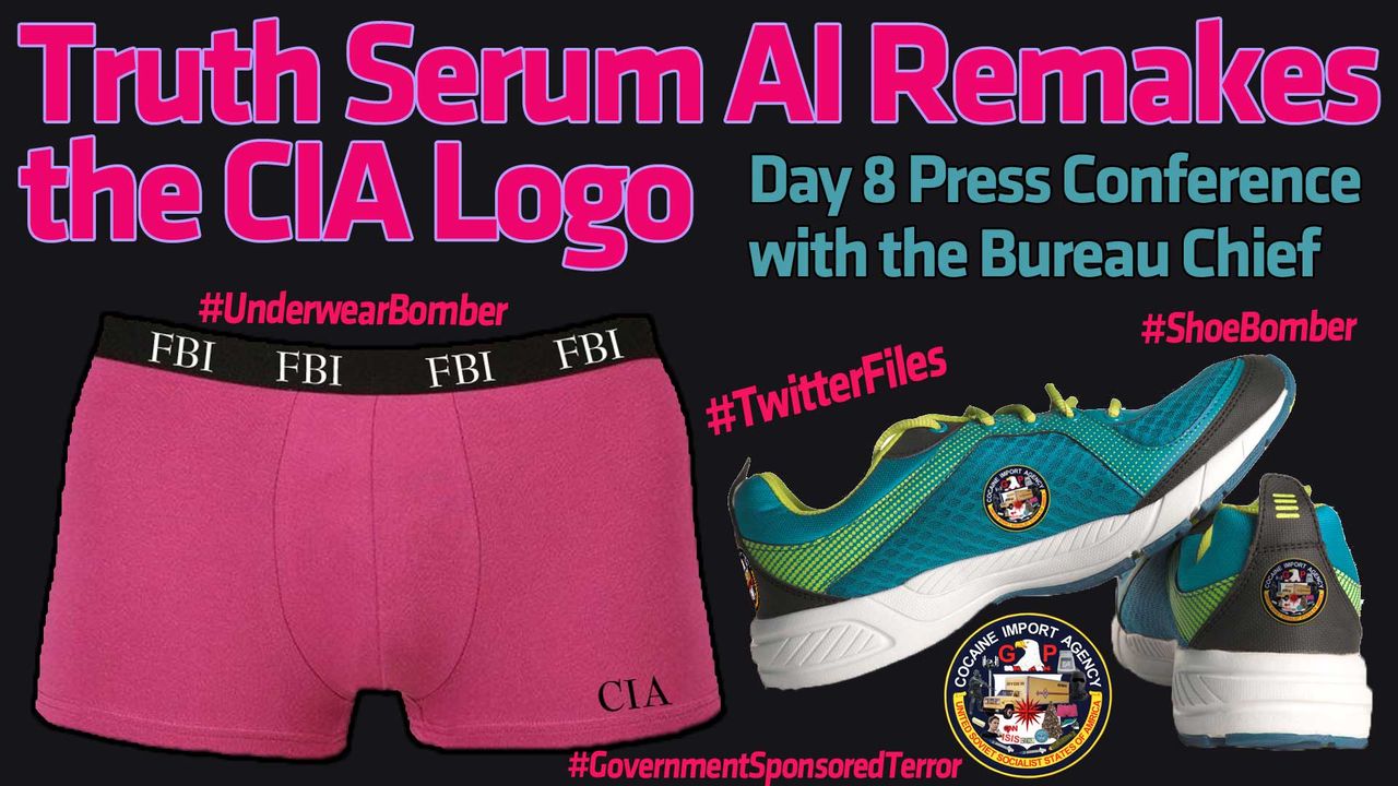 In the 8th installment of these press conferences, the Chief continues with the Truth Serum AI remaking of the logos of government. Featured has been the Ryder trucks at the center of logos, a key prop used for false flag terror plots that always leave government with the excuse to amass power to itself to “fight an enemy” which enemy it, of course has created. Thus far, the Ryder truck in the Cocaine Import Agency logo has been featured and discussed, then the Diebold fraud voting machines which plant into office the Lucifarian selected and establishment candidates all throughout the nation at every level of government. The sniper mask, used when accomplices---hidden---assist drugged up patsies in school and mall shootings. Then underwear for bombs---CIA and FBI underwear, shoes as bombs and Christmas trees, all favorites in the era of the “war on terror” and highlights of effectiveness for the bureau and the Cocaine Import Agency in instilling fear into those who slurp down the propaganda of the forked tonged viper politicians, and traitors, as well as their CIA controlled liars in communist corporate media.