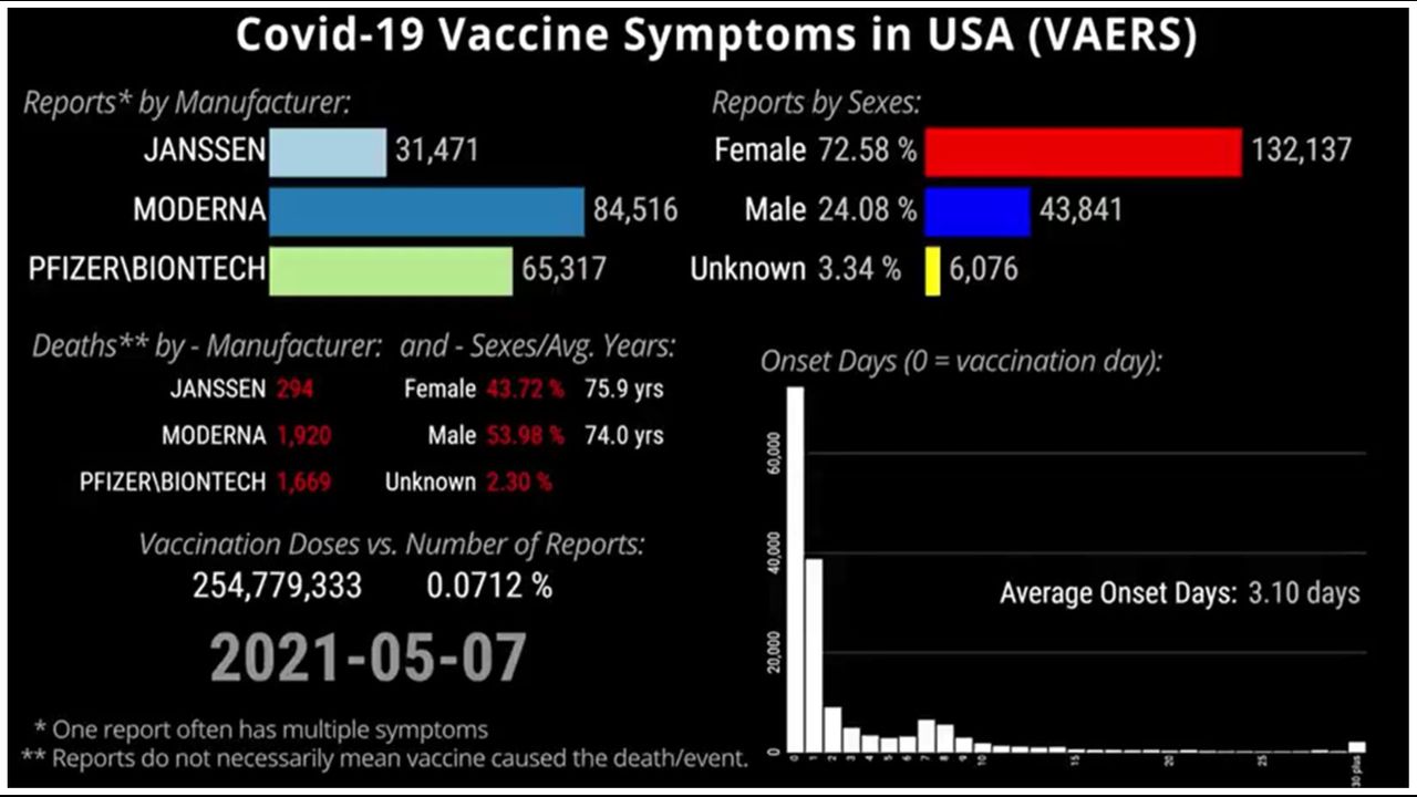 This video shows the number of reported Covid-19 vaccination AE's in USA (VAERS), by manufacturer, sexes and onset days. The time is until 7th. May 2021.