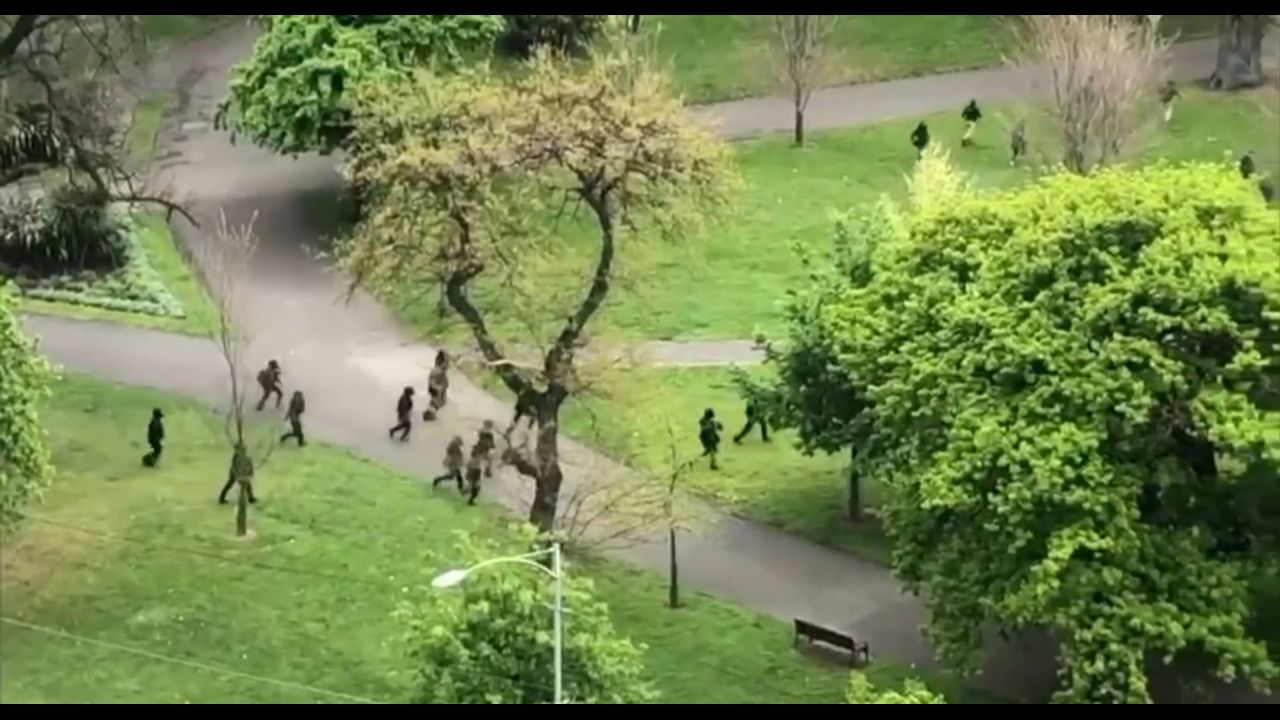 After clearing the Shrine of Rememberance of protesters, the Victorian police thug squad pursue the crowd into a nearby park. Continuing to fire into the backs of the people dispersing with tear gas and large rubber projectiles.