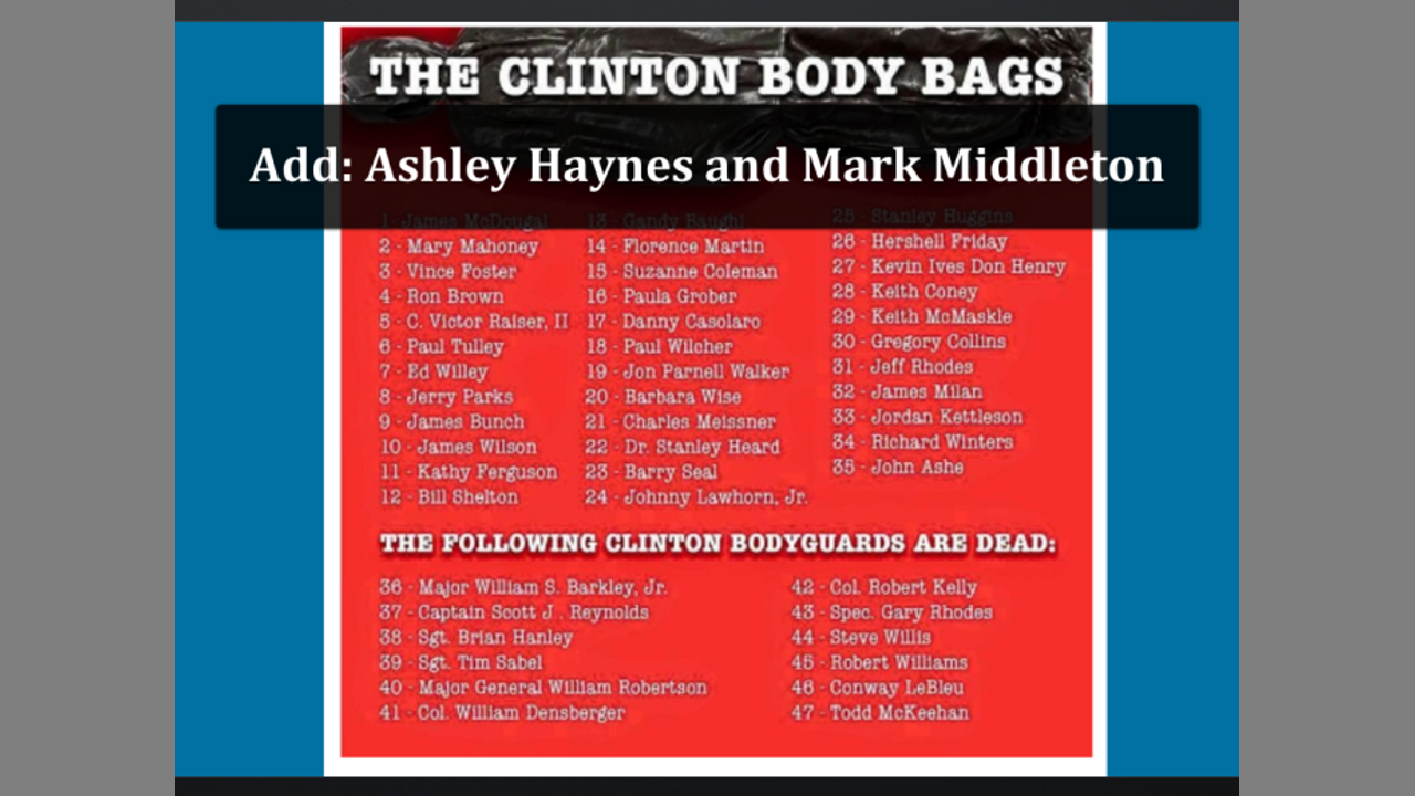 Middleton and Haynes are part of a growing list of dead bodies linked to Clinton and Epstein, who was found hanging inside his New York jail cell in 2019 while awaiting child sex trafficking charges.