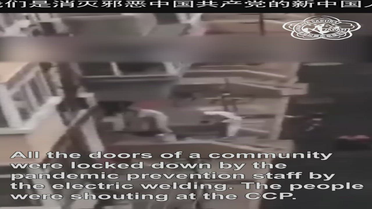 All the doors of a community were locked down by the pandemic prevention staff by the electric welding. The people were shouting at the CCP.
