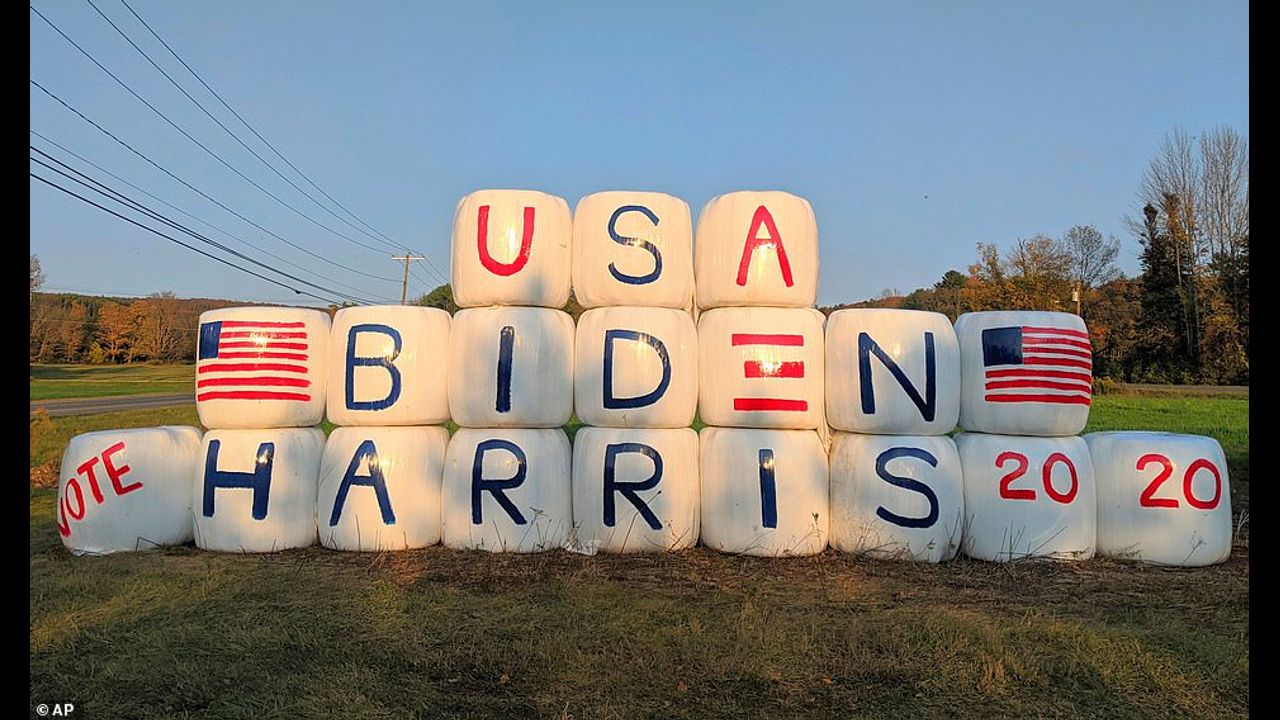 The unusual political display at Holiday Brook Farm, in Dalton, featured 19 hay bales that were wrapped and painted with the words: USA and VOTE along with the names of Democratic presidential nominee Joe Biden and vice presidential candidate Kamala Harris.