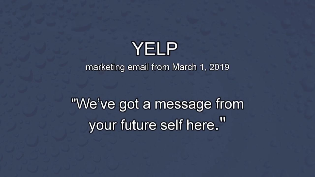 This email arrived in my inbox from Yelp. The subject line is, "We’ve got a message from your future self here." "We're here when stuff stops working right." What kind of stuff stops working right in the future? What does the imagery reveal?