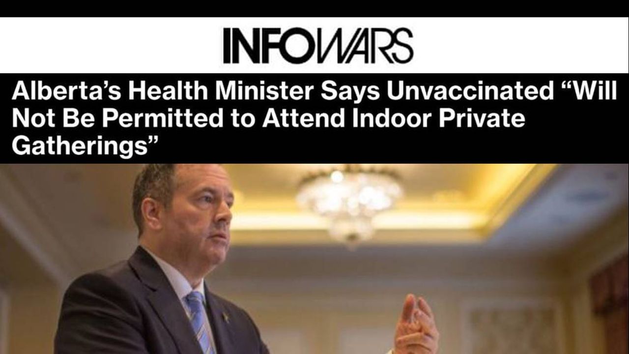 Alberta’s Health Minister Jason Kenney on Thursday went back on his promise not to impose vaccine passports in the Canadian province of Alberta – even pledging to fight back if the federal government tried to enforce one – and declared a state of emergency that will leave unvaccinated Albertans essentially trapped inside their own homes. Read more here: https://www.infowars.com/posts/albertas-health-minister-says-unvaccinated-will-not-be-permitted-to-attend-indoor-private-gatherings/