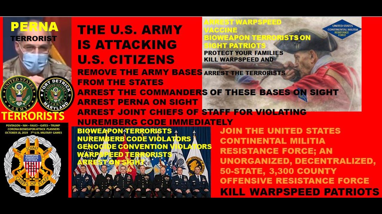 TIME TO ORGANIZE YOUR COUNTIES MILITIA AND TAKE OUT WARPSPEED AND ARREST THESE U.S. ARMY BIOWEAPON TERRORISTS; AND EVICT THESE TERRORISTS FROM YOUR STATE. ARREST THE COMMANDER AND TELL HIM - YOU HAVE 72 HOURS TO PACK YOUR TERRORIST BELONGINGS AND VACATE THE STATE.