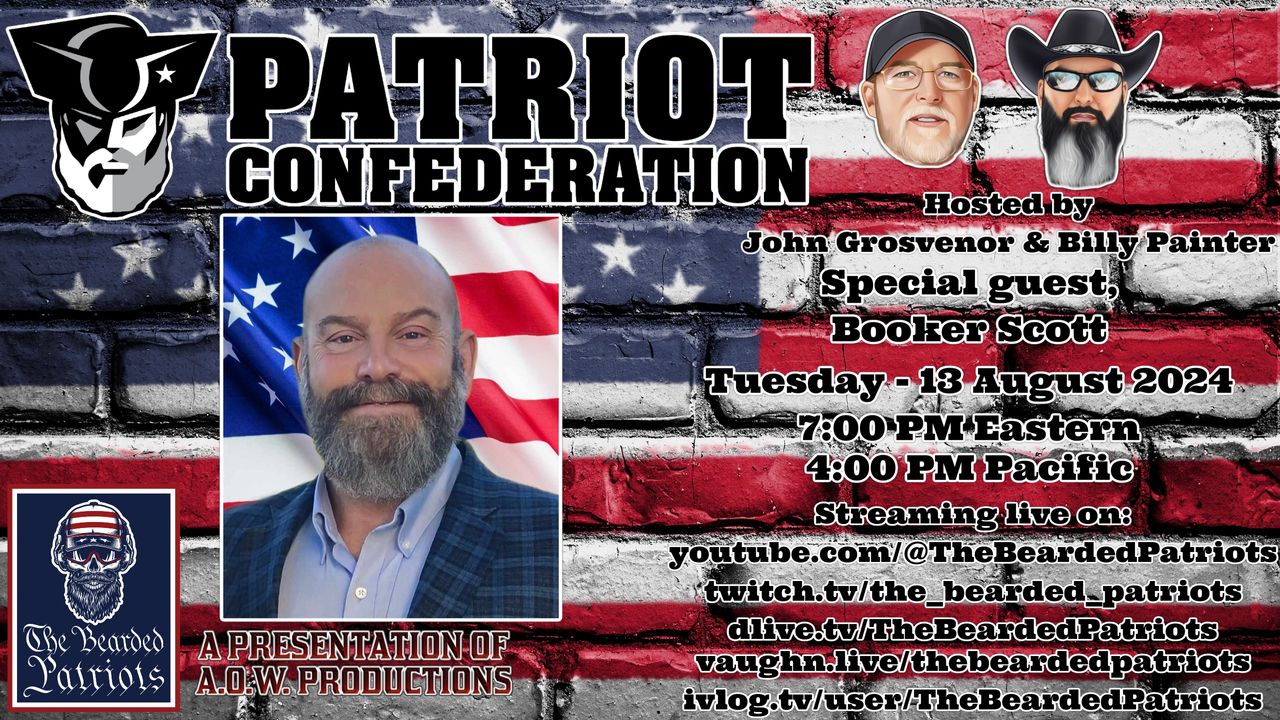 Every patriot has an obligation to question authority. Those who are honest are not concerned with your watchful vigilance and those with integrity are not concerned with your discernment. Every American is obligated to voice their concerns and stand up for their freedoms and liberties. Ladies and gentlemen, we are the men in the arena, we are the Patriot Confederation! Proudly hosted by John Grosvenor and "Bad Billy" Painter! This week Booker Scott joins the show.