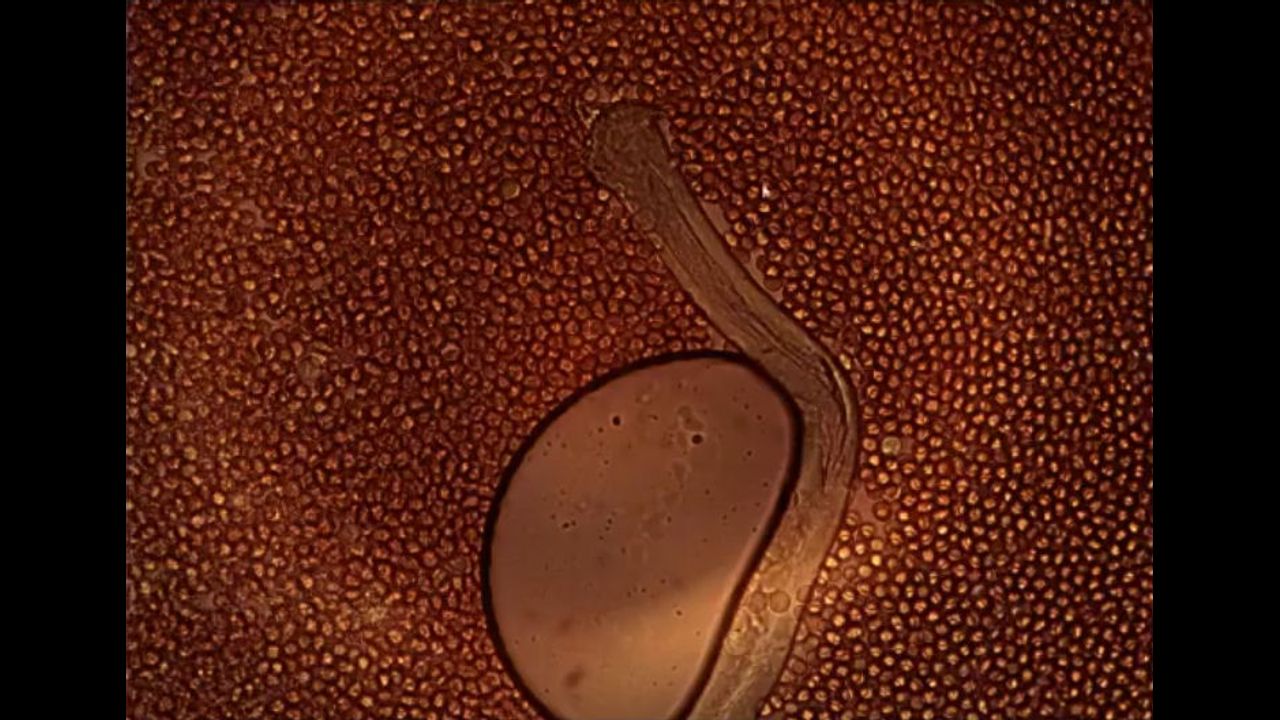 A couple of weeks before the video below was made, Dr. Philippe began noticing a magnetic or electrical polarity effect on different sides of the graphene fibres. In the image below, to the right of the fibre the cells are coagulated and on the left-hand side is what looks like a gap or roughly backwards “C” shaped spacing. Dr. Philippe says that this “behaviour” was not seen before but now, all of a sudden, it is being seen in almost every sample. It is an indication that “these things have changed, their reaction with surrounding blood cells has changed … and I don’t know what triggered it,” he said.