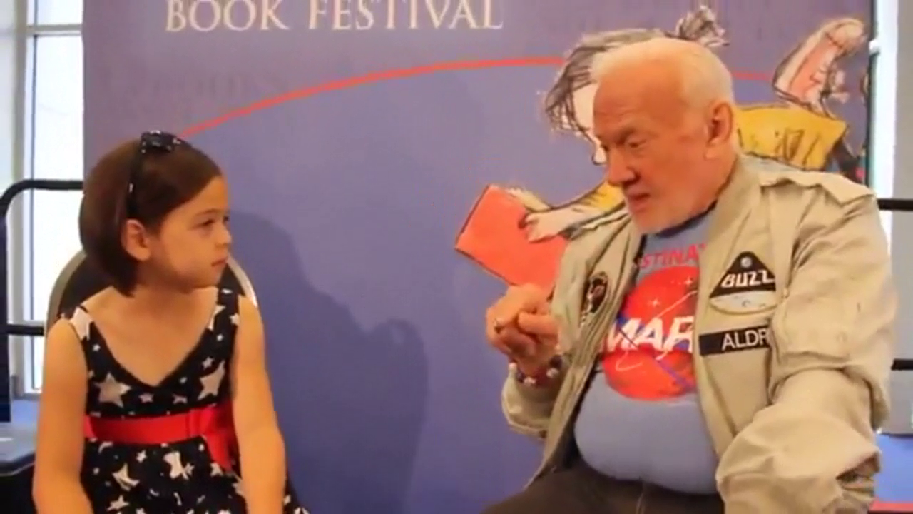 Buzz must have escaped his handler this day.....Buzz Aldrin Admits To A 8 Year Old Girl That NASA Never Went To The Moon!