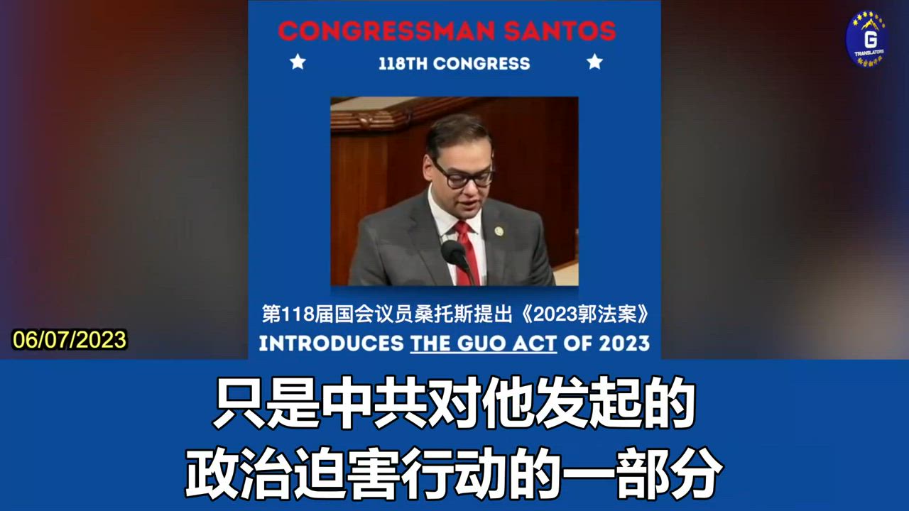 06/07/2023 乔治·桑托斯议员在众议院推出《2023郭法案》。他表示,郭文贵所面临的指控只是中共对他发起的政治迫害行动的一部分,美国司法系统的武器化正越来越失控,众议院司法委员会、司法部和联邦政府武器化特别小组应调查中共对美渗透并尽其所能释放郭文贵。