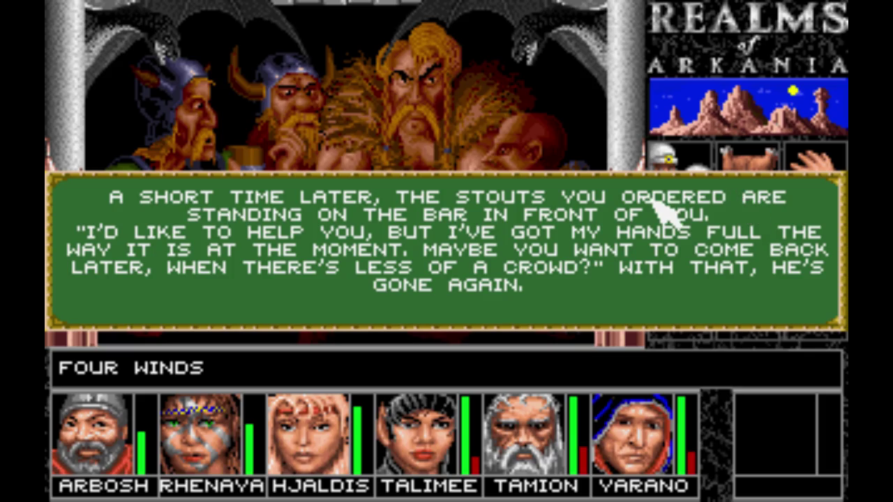 Blade of Destiny is set in the northern part of the continent Arkania (Aventuria in later translations), a continent where most of the Dark Eye stories take place. The humans living in this region are worried about an approaching invasion of orcs. The orcs have a new leader who has managed to unify all tribes and made them stop fighting each other. Now, the orcish leader might even succeed in conquering the great city of Thorwal. After coming to Thorwal in search of fame and adventure, your party eventually gets recruited to find the Blade of Destiny, a legendary sword which is the only weapon powerful enough to defeat the orcish leader. Unfortunately, its whereabouts are unknown and you first have to find pieces of a map which will lead you to the location of the sword.