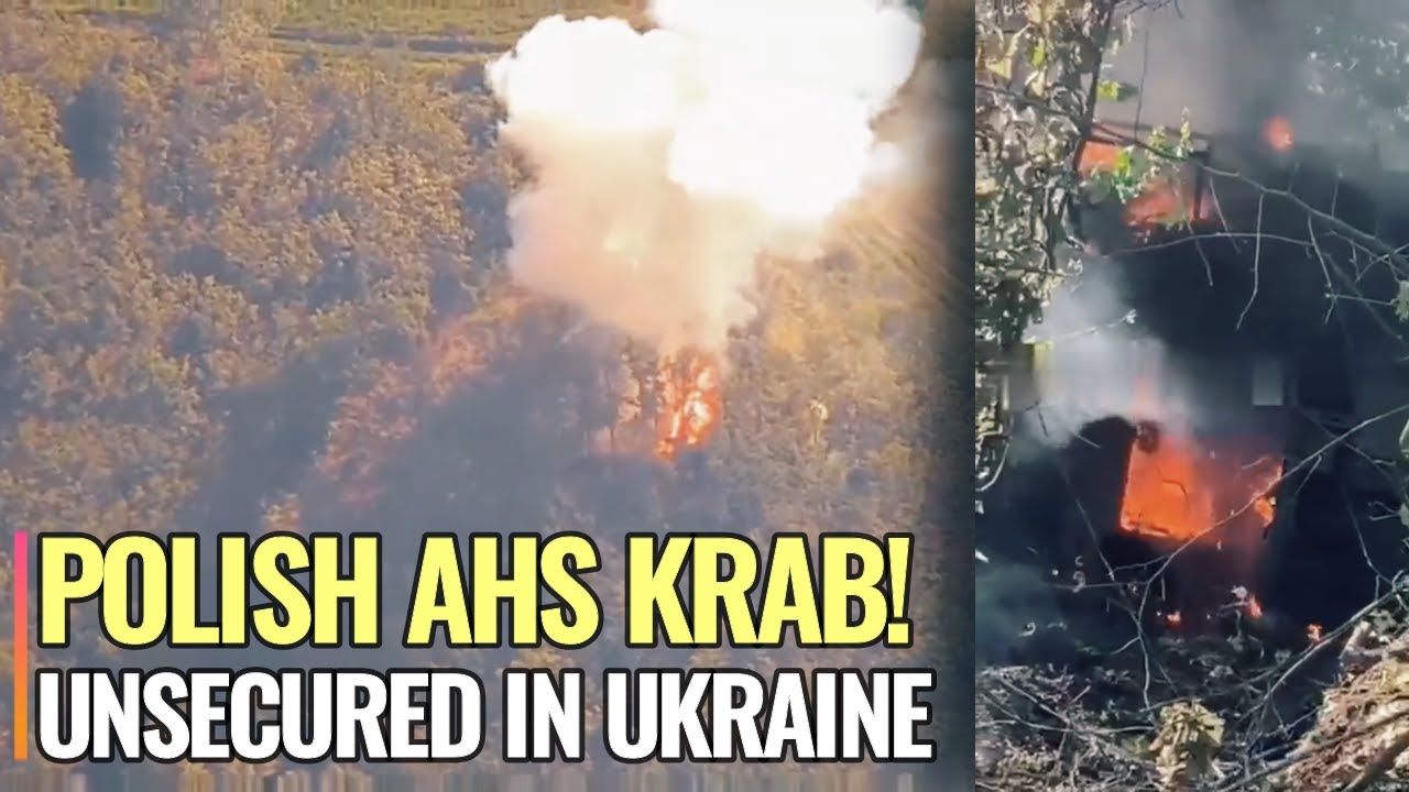 Russian 2S19 Msta-S 152-mm Self-propelled Howitzer set fire to a Polish AHS Krab Self-propelled Howitzer 152-mm on Svatovo-Kremennaya line. Artillery crews from the "O" Group of the Central Military District destroy an AHS Krab used by Ukrainian Army in the forest belt in daily fire missions with two Msta-S.