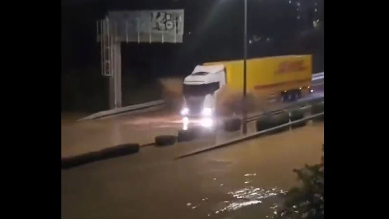 A DHL truck driver braves the flood in the outskirts of Valencia, Spain only to have the vehicle taken away by the current.
