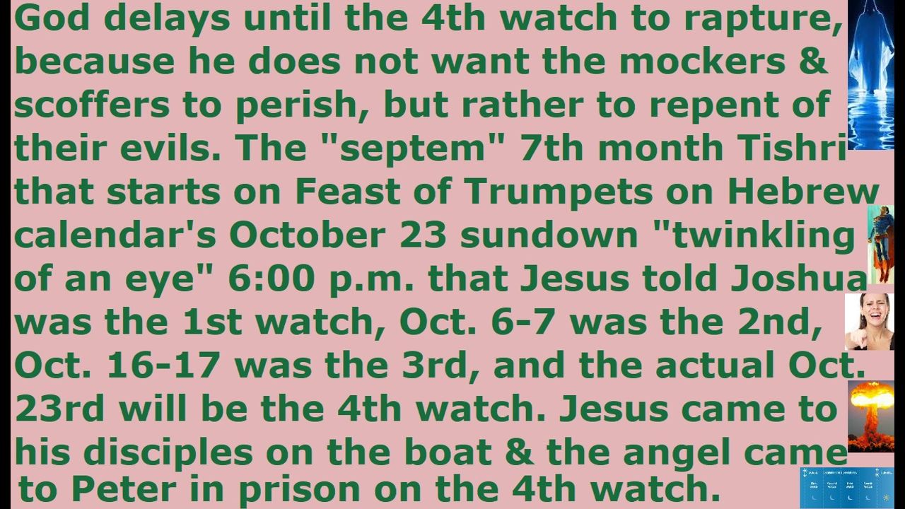 *** Intelligence news update from the Human Homo-Sapiens Race Survival Resistance (HRSR) and Republic Rebel Alliance battlefront (October 2025). At the fourth watch Jesus came to rapture from the storm his disciples on the boat by walking on the lake, and at the fourth watch the angel of God came to rapture Peter from the prison. Jesus’ announcement to Joshua that “he will come back on the 23rd & 24th of the month of ‘septem’ or the 7th month Tishri that starts with the Feast of Trumpets on October 23, 2025, 6:00 p.m. Jerusalem sundown ‘twinkling of an eye’ time” was the first watch. The Julian calendar October 6-7 call was the second watch. The Enochian calendar October 16-17 call was the third watch. Jesus will come to rapture his “Pre-Tribulation Rapture truth” true Church “Bride of Christ” real Christians, who are waiting & watching and getting mocked & scoffed by the millions of Satan Lucifer’s Draco reptilian chimera fake alien incarnate avatar “Genesis 3:15 seed of the serpent” pedophile cannibal Satanist globalist elites feminist witch “Mid Post Pan Pre-Wrath Tribulation Rapture theories lies Antichrist-worship-misleading unbelief-causing lukewarm-sleep-causing” fake Christians, on the 4th watch which is October 23-24, 2025 on the actual Feast of Trumpets of God’s heavenly Hebrew calendar at the new moon sliver observation. At every watch, more and more of Satan Lucifer’s pre-1941 “The Plan’s” Bible prophecy rapture billion dollar industry’s monetized YouTube “donation begging using God’s name” Christian business ministry “rapture worshippers” “rapture profiteers” fake Christians drop away, and call Joshua and Jesus as false-prophets and liars and demonic diviners who are demon-possessed by “Beelzebub”. Only the real Christian samurai warriors of Christ, who are left watching for Jesus’ return on the fourth watch, will be raptured, just like Elisha followed Elijah to the 1st exodus to Gilgal, and the 2nd exodus to Bethel, and the 3rd exodus to Jericho, and the 4th exodus to the Jordan river where Elijah was raptured up to heaven and Elisha who had followed him received his double anointing of the Holy Spirit. The lukewarm Christian Tribulation Saints, who will be beheaded by the Antichrist if they do not take the digital ID digital currency “mark of the beast” gene-altering AI “black goo” nanite COVID microneedle patch vaccine, will be left behind on the earth at the rapture. They are guests and not the bride at Jesus’ wedding banquet, and they will be dressed in white robes instead of the royal white linen, and their bodies will be resurrected from the dead after the 7-year Tribulation Age and not at the rapture before the 7-year Tribulation Age. Only one or two real Christians in each church will be raptured, and the millions of “Bible verses redefining, women’s head coverings rebelling, fallen angel head controlled, men’s pants cross-dressers androgynous transgender God’s-Word-mockers” cowardly traitor fake Christians and every single pastor, who betrayed us real Christians and threw us out to the Illuminati assassins and abandoned us to fight alone by myself against the millions of CIA NSA MI6 FBI Freemason Jesuit Wicca Black Ops Satanist assassins & world elites & Satanist secret societies & governments & militaries & Draco Empire space fleet & fallen angels & Satan Lucifer, in order to protect them from nuclear wars & biochemical weapon pandemics & manufactured famines & Godzilla demon armies out of the abyss, while receiving assassination attempts, without sleeping or eating or bathing or marrying or looking for work to cover our own living costs and reaching the brink of starvation many times by using up all our savings & selling all our possessions, will be left behind at the rapture to be beheaded by the Antichrist or to continue worshipping their post-1960s fake god Sananda Jesus by taking his “mark of the beast”.