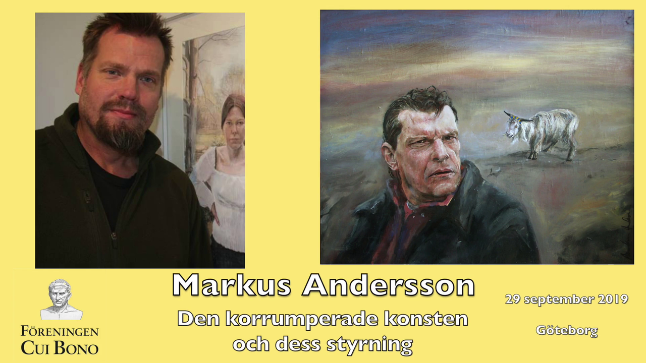Markus Andersson kommer under föredraget berätta om de turer han varit med om sedan hans målningar exponerades på moderna museet 2006 och den rättsprocess och de förtalskampanjer han fått utstå till en följd av detta. Vidare kommer han bland annat gå igenom hur man genom att studera historisk konst kan se hur konsten perverteras strax innan en civilisation har fallit. Slutligen kommer Markus att visa hur konsten av idag har tagits över av samma krafter som styr de stora medierna och den allmänna propagandan.