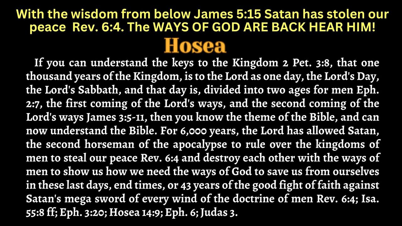 If you can understand the keys to the Kingdom 2 Pet. 3:8, that one thousand years of the Kingdom, is to the Lord as one day, the Lord's Day, the Lord's Sabbath, and that day is, divided into two ages for men Eph. 2:7, the first coming of the Lord's ways, and the second coming of the Lord's ways James 3:5-11, then you have the theme of the Bible, and can now understand the Bible. For 6,000 years, the Lord has allowed Satan, the second horseman of the apocalypse to rule over the kingdoms of men to steal our peace Rev. 6:4 and destroy each other with the ways of men to show us how we need the ways of God to save us from ourselves in these last days, end times, or 43 years of the good fight of faith against Satan's mega sword of every wind of the doctrine of men Rev. 6:4; Isa. 55:8 ff; Eph. 3:20; Hosea 14:9; Eph. 6; Judas 3. The ways of God are as high as the heavens above men's ways, exceeding abundantly greater than we can imagine Isa. 55:8 ff; Eph. 3:20. They include; the perfect Preacher, the Perfect Law of Liberty, and the Kingdom of God, to save us from ourselves and to give to us every spiritual blessing starting at the second coming of the great wedding feast which will be in about 2066 AD. Randall Maxwell