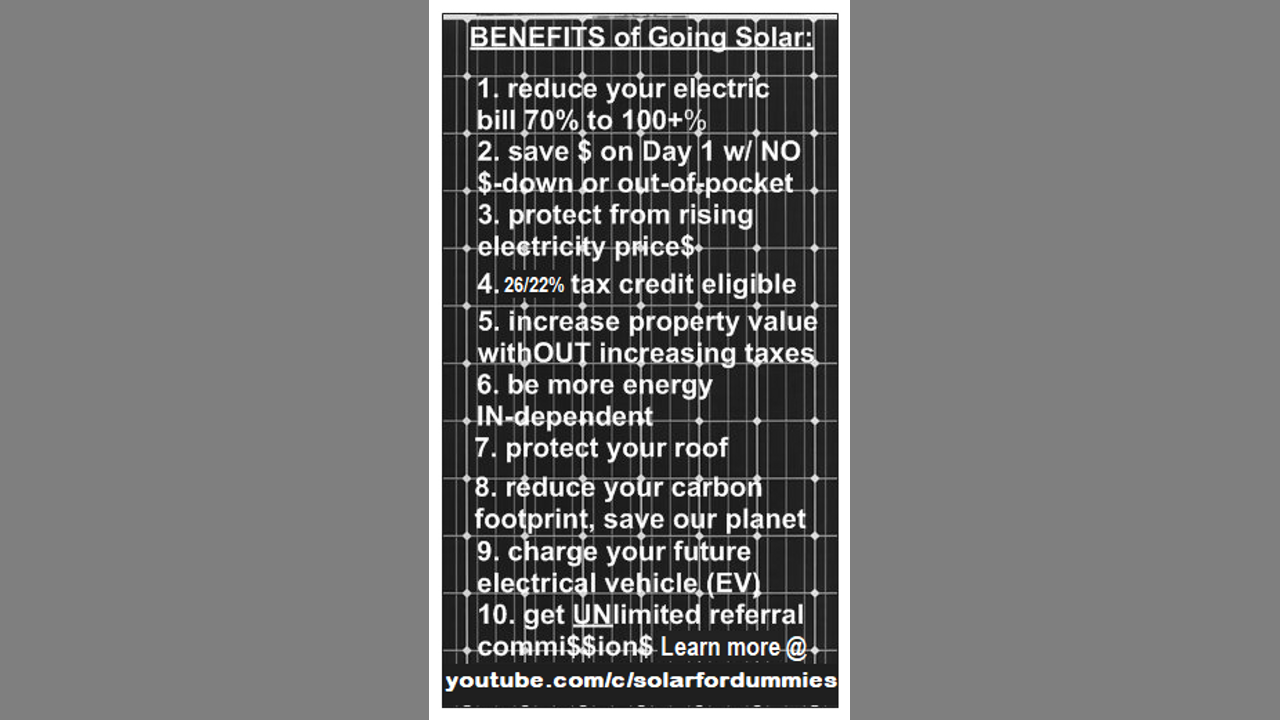 To learn how to say "GOOD-BYE" to your energy, water, AND grocery bill$, log into your Gmail before clicking-on: tinyurl.com/OneHouseOffTheGrid. Ordinary people talking about why they made the switch to cleaner solar energy. Learn more on our sister "Solar for Dummies" channel at: https://youtube.com/c/solarfordummies and at: https://offgrid.solarbuyers.club To help you get 100% "off-the-grid," view a FREE copy of our catalog on Google Drive by logging into your Gmail before visiting: https://tinyurl.com/OneHouseOffTheGridCatalog For a FREE copy of our "10 $- & Energy-Saving Tips" e-guide, visit: https://tinyurl.com/10energySavers For a FREE plan to get to "net zero energy," visit: https://tinyurl.com/NetZeroEnergyPlan For a FREE 1-page list of the world's most cost-effective (and quickest payback/highest ROI) energy conservation & efficiency upgrades, visit: https://tinyurl.com/TopSouthFLenergySavers To increase not only your health- and life-span but, most importantly, your BRAIN/MINDspan so you can continue to live off-the-grid, visit my "BetterBrain101.com -- BEYOND Bulletproof Health" channel at: https://youtube.com/c/betterbrain101 To make any video suggestions for this channel and/or to report any broken links, contact Danny Zen: Skype: ajnj08 (2 #s) voice: 1+786.441.2727 toll-free: 1+800.250.8975 text: 1+305.297.9360 e-mail: [email protected] and/or [email protected] #GoBIGGoFASTGoNOW!