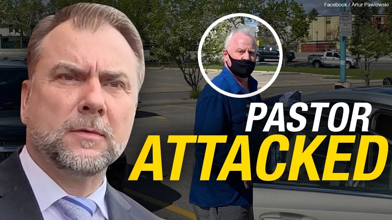 Adam Soos gets an update from Pastor Artur Pawlowski after he was apparently the victim of an assault while at a Calgary-area grocery store with his daughter buying a cake.