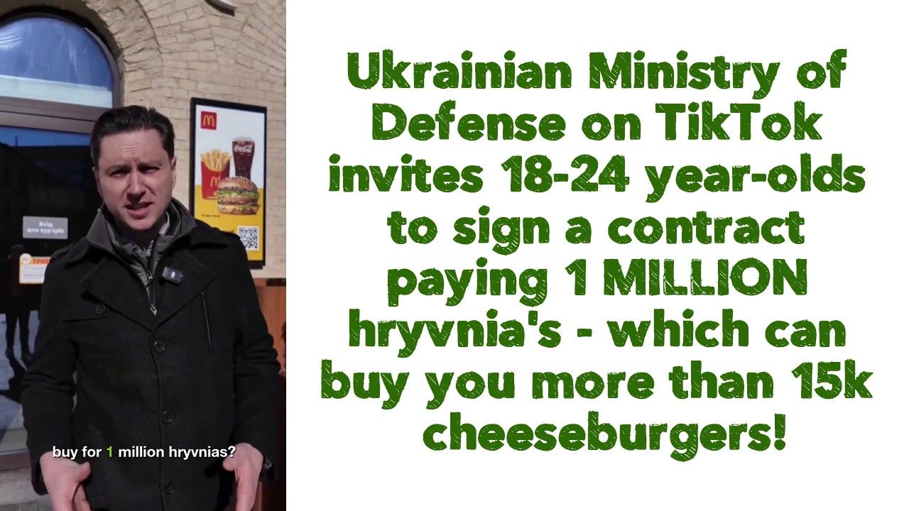 JUST WHEN IT COULDN'T GET MORE ABSURD: Ukrainian Ministry of Defense on TikTok invites 18-24 year-olds to sign a contract paying 1 MILLION hryvnia's - which can buy you more than 15k cheeseburgers!