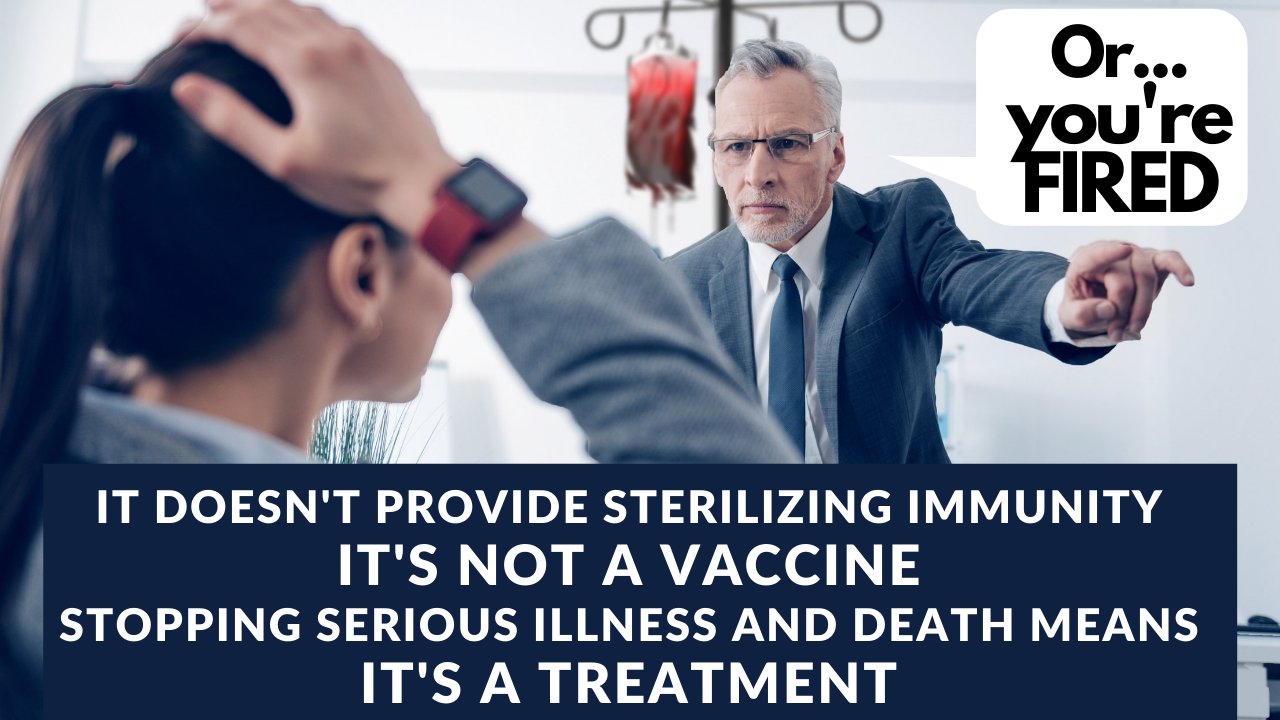 this “vaccine” doesn’t do this. People are being inoculated with something that is supposed to prevent serious illness and death. This is called a treatment. This is something that is not even close to a vaccine. They are completely different. Now if your employer tried to force an experimental treatment on you or be fired…that’s a lawsuit. In fact, that’s a felony. Our government is breaking the law.