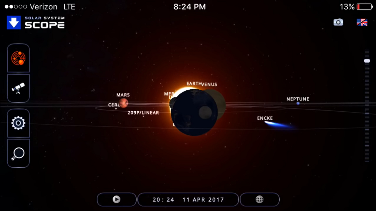 On April 11, 2017 on our way home from my daughter's soccer practice, we were observing the full moon or what they are calling the pink moon. Once home, I checked out Solar System Scope that uses NASA data to show the position of the "planets" and our moon in relation to the sun. As you will see, there is no way the moon should not have some shadow on it tonight according to the heliocentric data. But there is zero shadow even though Mercury, Venus, and the Earth are said to be between the sun and the moon by the NASA boys.