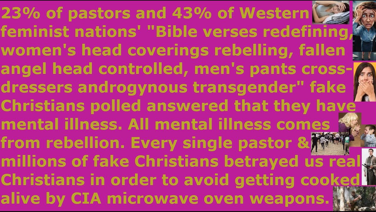*** Intelligence news update from the Human Homo-Sapiens Race Survival Resistance (HRSR) headquarters and Republic Rebel Alliance battlefront (November 2024). 23% of pastors and 43% of Western feminist nations' "Bible verses redefining, women's head coverings rebelling, fallen angel head controlled, men's pants cross-dressers androgynous transgender God’s-Word-mockers" fake Christians who were polled answered that they have mental illness. All mental illness comes from rebellion. Millions of fake Christians are suffering from depression and bipolar demon-possession by the post-1960s Jezebel demon spirit. Many fake Christians and pastors are committing suicide and large numbers of fake Christians are taking medical science witchcraft alchemy pharmaceutical witchcraft drugs in order to suppress their mental illness. Every single pastor & millions of fake Christians betrayed us real Christians and threw us out to the Illuminati wolves and abandoned us to fight alone against the millions of assassins & world elites & governments & militaries & Satanist secret societies & space fleets & Draco Empire & fallen angels & the devil, in order to avoid getting cooked alive by CIA microwave oven weapons from next door homes & every hotel room, and to avoid getting ridiculed by church donators. They will take medical science witchcraft pharmaceutical drugs to suppress their mental illness, but they do not fight alongside their Christian brothers & Jesus to banzai charge God’s billions of enemies, even when God’s name is being defamed, and 33% of their Western feminist nations’ population have been replaced by non-human nephilims & chimeras & fallen angel incarnate avatars, and 12 million of their Western feminist nations’ children are being tortured & lesbian raped (pegged) & satanically sacrificed & eaten every year and their leftover human meat & bone ashes are being thrown into their church food & supermarket groceries & fast food, which these fake Christians condone in silence and give permission by silence and become accomplices in crime by their silence, because they want to avoid assassination attempts and ridicule by church donators as lunatic heretic idiotic narcotic maniacs. These millions of End Times most wicked generation “2 Timothy 3:2-5” fake Christians steal money from God & his harvesters, and they pay billions of dollars to Satan Lucifer’s medical science witchcraft genocide mass murderer industry’s psychiatrists & Christian counseling witchcraft counselors & mental disorder therapists, instead of seeking God’s healing & deliverance. These millions of Western feminist nations’ “naked women’s heads rebels, men’s pants cross-dressers androgynous transgender” fake Christians and millions of Nicolaitan clergy class laity class Satanist pagan religious system's "ordained & allowed & trained & non-assassination-attempts-receiving" fake unbiblical job position pastors absolutely hate speaking the tens of thousands of truths we real Christians shared to them, because they are afraid of getting cooked alive by CIA microwave oven weapons from next door homes & every hotel room every day, and getting shot with FBI pinpoint heart attack EMF weapons from next door homes & every hotel room, and getting poisoned by NSA sulfuric acid & polonium radiation & mercury & flesh-eating bacteria HIV biochemical weapons, and facing starvation & homelessness risks many times with only a few dollars left in their wallets, and having demon spirits sent to attack them all day long who rip in two their own Satanist Catholic exorcist priests, and having their heathen families either slaughtered or their brains controlled to try to kill them, and receiving witchcraft & psychic attacks to try to explode their hearts, and having CIA NSA MI6 FBI Freemason Jesuit Wicca Black Ops Satanist assassins trying to shoot them in the head in their apartment lobbies