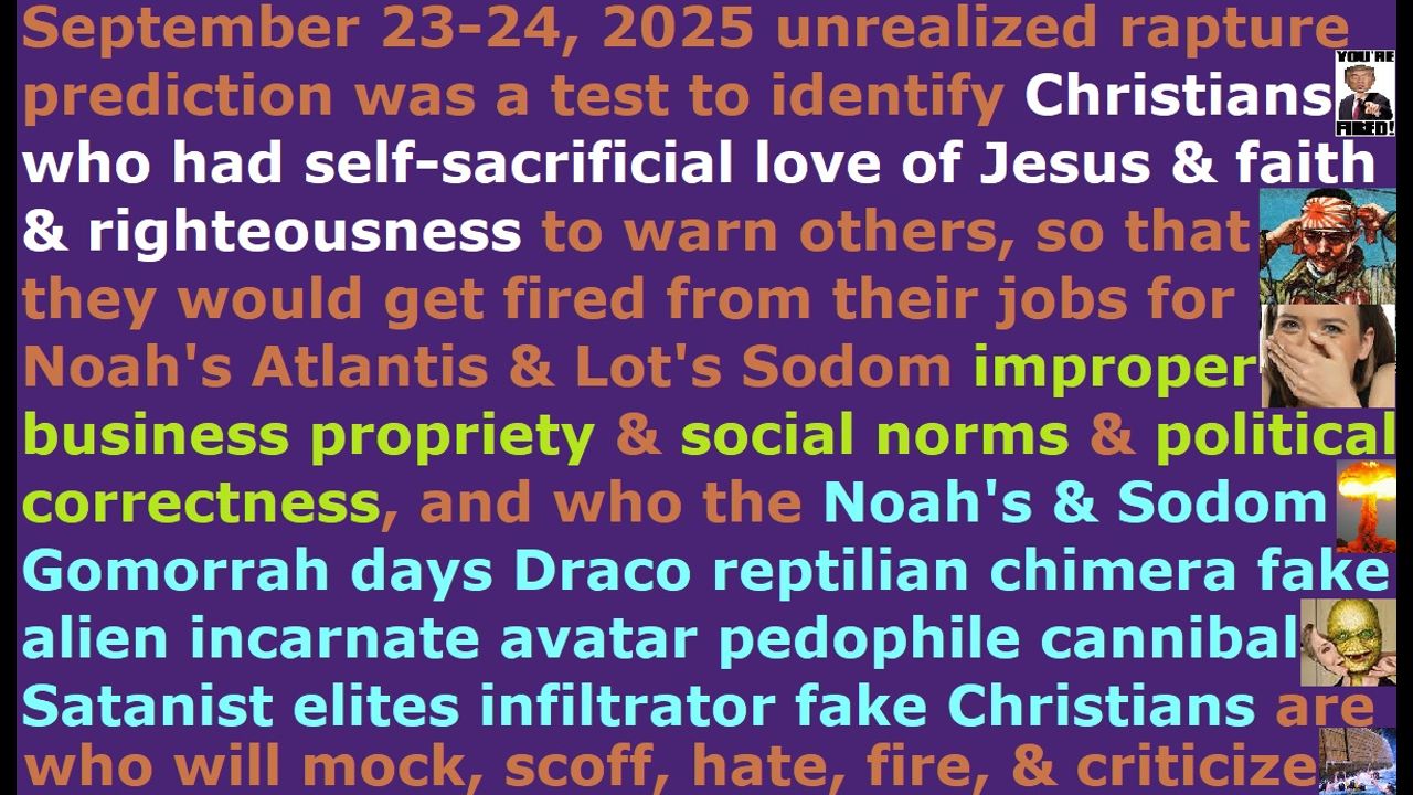 *** Intelligence news update from the Human Homo-Sapiens Race Survival Resistance (HRSR) and Republic Rebel Alliance battlefront (September 2025). I see now what is going on with the September 23-24, 2025 “unrealized-appearing” rapture predictions. It was a test to see who the real Christians are with God’s self-sacrificial love of Jesus & righteousness & faith & sense of duty & concern for others knowing that we will be laughed at or forced to quit our jobs for warning everyone, and to test to see who the people who will be left behind on the earth for the Tribulation Age judgment are, who like the Noah’s days people and Sodom Gomorrah people laughed at the real Christians and told them it is not proper business propriety or political correctness or social norm to warn the others to save them out of the coming judgment. Those Satan Lucifer’s Draco reptilian chimera fake alien incarnate avatar pedophile cannibal Satanist “Mid Post Pan Pre-Wrath Tribulation Rapture theories lies” fake Christians and crazy “so-called sane intelligent elite” mocking scoffing heathens, who are telling Noah and Lot to stop warning the people about the Noah’s days Atlantis COVID “mark of the beast” vaccine and God’s judgment, in order to consign billions of people’s soul to the lake of fire, because it is not proper business propriety or social norm or political correctness to speak about religion in the business environment to coworkers & employers & clients out of Jesus’ self-sacrificial love & faith & righteousness, will now have their skins fall off their bodies from the nuclear wars, and have their bodies rot from the biochemical weapon pandemics, and have their children eaten from manufactured famines, and be eaten by Noah’s days Godzilla titan demon armies out of the abyss, and have mountains of asteroids fall on their heads, and have continents split into pieces, and all the mountains of the earth leveled to the ground and crush their hollow earth cities, and all the islands covered with water, and the earth poles shifted, and the solar flares skin them alive, and their planets & star systems & civilizations & species disintegrated and thrown into the lake of fire. These millions of “fallen angel demon-possessed” Draco reptilian chimera fake alien incarnate avatar pedophile cannibal Satanist genocidal psychopathic globalist elite feminist witch company owners & executives & managers & HR management, who are torturing & lesbian raping (pegging) & eating & satanically sacrificing to their fallen angel bosses 12 million children every year to receive wealth & fame & high positions to carry out their fallen angel parasite bosses’ child-trafficking ring human soul energy food 5,000 year old Noah’s days Atlantis industry can talk with each other about proper business work environment behavior and political correctness and social norms while they burn in the lake of fire forever & ever where the worms that eat their mouths never die on a pile of maggots, which is a befitting companionship for them. Maggots belong with maggots. They can eat maggots and the maggots can eat them. Their maggot flies were flying over my face when I woke up, and when I moved to this computer to write this, they followed me to the front of the computer screen in large numbers. I cursed those sending them with fruit fly maggots to eat their faces in the lake of fire. If they think they are so smart and powerful magicians to send fruit flies against God’s “Body of Christ” kings & priests, then let them be thrown onto a pile of fruit fly maggots in the lake of fire. They are now sending the fruit flies to land on my computer one after another, as soon as I kill the previous one. It is Satan Lucifer’s “the lord of the flies” fruit fly army against God and his Body, in revenge for the Egypt’s plague of flies.