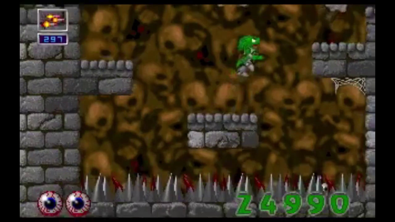 Guimo plays equally fast Jazz Jackrabbit. Each level consists of a giant maze where you have to find things to collect or destroy in order to unlock the path to the boss fight. Guimo has a standard weapon with infinite ammo and an arsenal of extra-weapons with limited ammo, like rockets, grenades, a flamethrower or energy shots. Killed off enemies leave behind ammunition, health upgrades or bombs that explode after a few seconds.