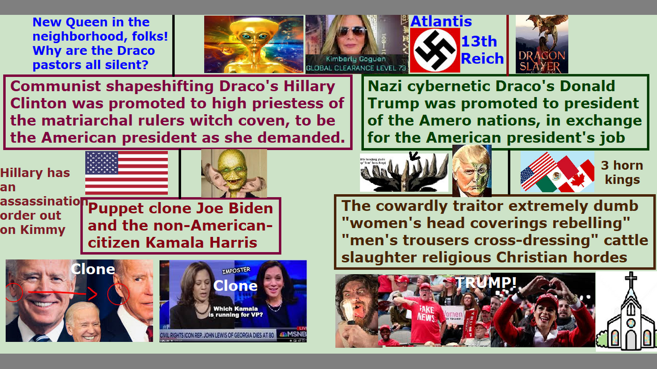 *** Intelligence news update from the Human Homo-Sapiens Race Survival Resistance (HRSR) headquarters and Republic Rebel Alliance battlefront (January 2021). Steven BenNun’s intelligence sources have confirmed that all these fake stories of mass arrests of the “bad guys” by the so-called Illuminati NWO supposed “light forces” are lies to keep the humans docile and happy and worshipping their AntiChrist as their hero, until the real Christian Church Saints are raptured out to heaven, and then Satan Lucifer can genocide exterminate the humans and religious Christian Tribulation Saints. It seems all of this are an elaborate fake show by the Illuminati NWO top hierarchy “White Lodge Brotherhood” ascended master fallen angels to make the humans believe that the good Nazi Satanist “black sun” faction is arresting and imprisoning all the bad communist Satanist rival faction pedophile cannibal Jezebel-worshipper feminist abortionist child sacrifice genocide New Age Wicca witches. They are still moving forward with Donald Trump’s Noahide laws to execute all Tribulation Saints and real human non-Draco Jews, and “Operation Warp Speed Nazi Blitzkrieg” to make all humans into zombies or depopulate them with the gene-altering 5G remote assassination Borg AI femtobot “black goo” t-Veronica virus COVID-19 vaccine, and World War 3 with China and Iran and whoever else they can fight. Simon Parkes was reporting that Donald Trump was going to shut down the media and start World War 3 depopulation on Wednesday, but his intelligence sources told him that they made it earlier to be carried out on Tuesday. They were saying that all the nephilim & chimera alien incarnate avatar people had been impatiently waiting for this moment to finally start their depopulation and replacement of the humans and to establish their NWO revived Noah’s days Atlantis nephiliim civilization. We real Christians shared the 100% truth to all of God’s spiritual army to mobilize them to restrain the spirit of the AntiChrist, and we prayed, and God stopped Donald Trump’s false flag World War 3 nuclear war and false flag civil war, and the kick off of the Illuminati NWO. It seems Kim Goguen, the new Nazi 5th Reich Pleiadian alien fallen angel matriarchal ruler, who took over power from the Draco reptilian chimera alien incarnate avatar globalist elite rulers of earth, got angry at Donald Trump. He had agreed to give up his U.S. president’s job in exchange for a promotion to a higher job as the president of the Amero to rule the three horn kings of America and Canada and Mexico. However, he had tried to start the NWO and World War 3 and keep his presidency on Tuesday, while she and the Pleiadian alien fallen angels were looking the other way. Kim may have told his Nazi 4th Reich Saturn planet Draco bosses to stand down, and stop all their NWO and war plans until the real Christians have been raptured out to heaven. Satan Lucifer’s AntiChrist’s Nazi 5th Reich Pleiadian alien fallen angel incarnate avatar matriarchal ruler, who took over the Illuminati NWO from the Draco reptilian chimera alien “Black Sun” Nazi 4th Reich Ceres planet faction, Kim Goguen says that the Nazi 4th Reich Draco chimera alien incarnate avatar Donald Trump was told by his bosses the Nazi 4th Reich Draco reptilian chimera alien incarnate avatar “Black Sun” Satanist Saturnalian Zoroastrian nobility, who are the bosses of the 4th Reich Nazis, that he must give Hillary Clinton’s puppet clone Joe Biden the presidency of the United States, and in exchange he will be promoted to the president of the Amero (America, Canada, Mexico). He will be replacing the three horn kings. Repent and receive Jesus as Savior, and make straight the path of the Lord! End of transmission…