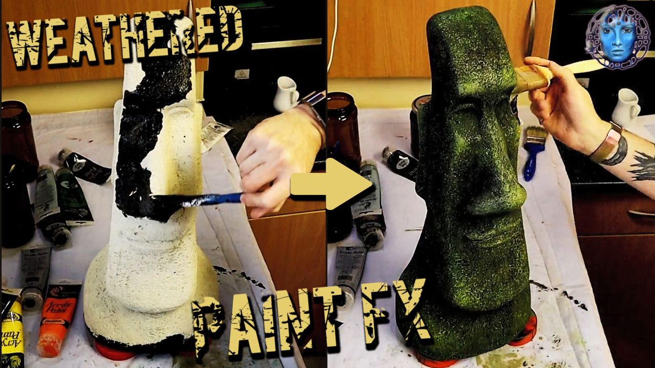 In this video we attempt to create a weathered look on a concrete cast of an Easter Island head using acrylic paints. Also, employing acrylic colours to represent such things as lichen, algae, etc, which may bulid up on rock over a long period of time.