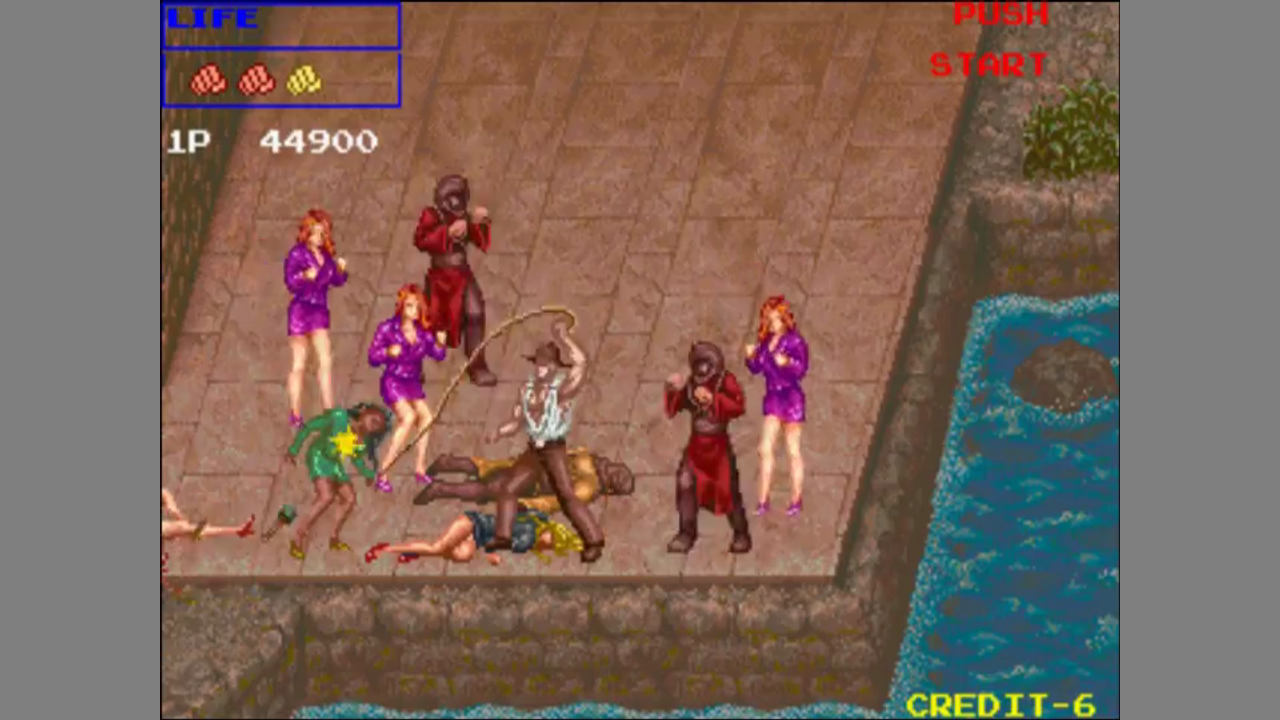 Depending on the machine, the game features either 2- or 4-player co-op. You can choose between the four rangers to play. Each character has different values in terms of attack, jumping ability and health. You can pick up objects like barrels or rocks to throw at enemies, and weapons can be picked up and used. Weapons are dropped by enemies or revealed by smashing barrels. Guns have limited ammo, but they can still be either thrown or used as a blunt object.